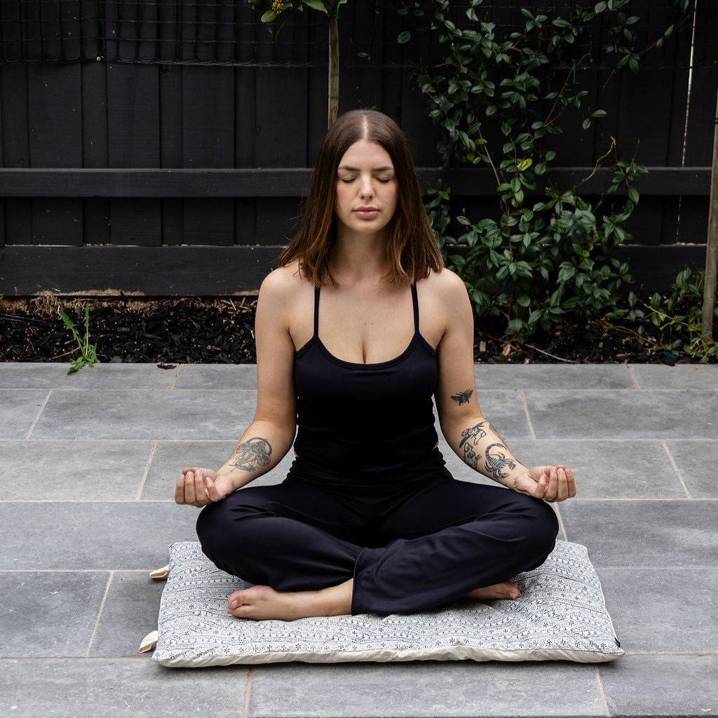 Experience serenity and timeless craftsmanship with our Meditation Cushion in Vintage Blue Block Print. Expertly handmade from 100% natural cotton and filled with breathable, eco-friendly kapok, this cushion provides firm, supportive comfort for your meditation or yoga practice.