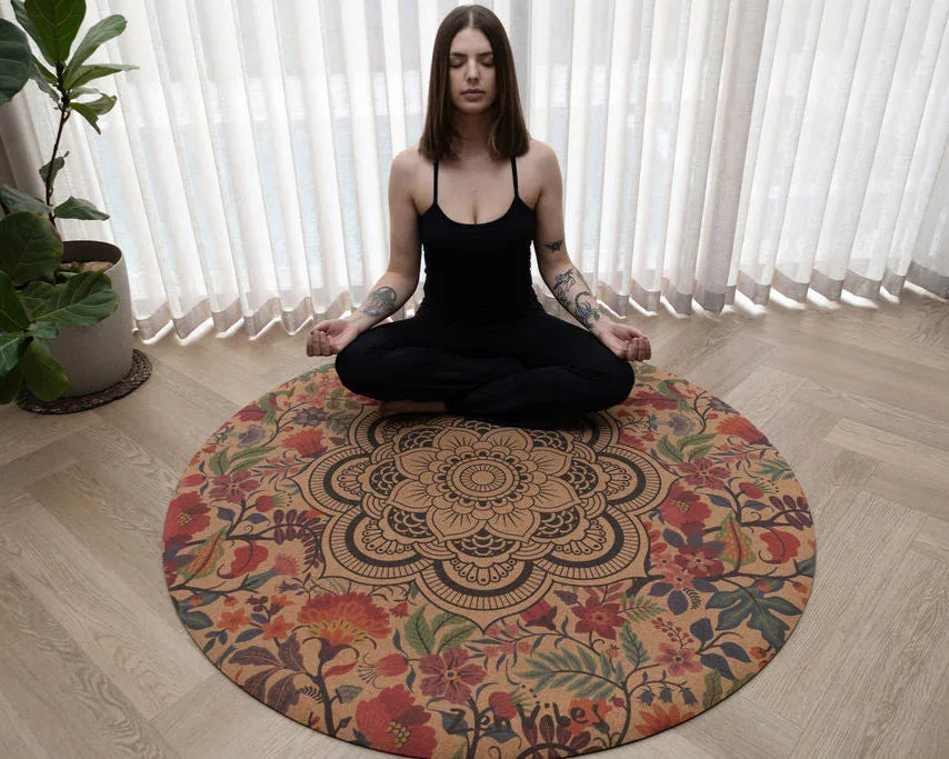 Premium Round Cork Yoga Mat – Ornamental Mandala 135cms
